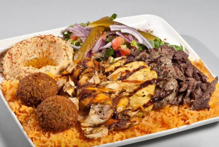 Beef or Chicken kabob, chicken Shawarma, gyros, grape leaves, hammus, grecian dip and a salad (serves two to three)